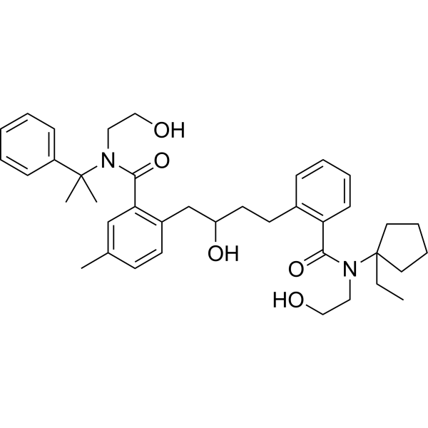 口服配方 3: 溶解于 PEG400 (聚乙二醇400) 请根据您的实验动物和给药方式选择适当的溶解配方/方案: 1、请先配制澄清的储备液(如:用DMSO配置50 或 100 mg/mL母液(储备液)); 2、取适量母液,按从左到右的顺序依次添加助溶剂,澄清后再加入下一助溶剂。以 下列配方为例说明 (注意此配方只用于说明,并不一定代表此产品 的实际溶解配方): 10% DMSO → 40% PEG300 → 5% Tween-80 → 45% ddH2O (或 saline); 假设最终工作液的体积为 1 mL, 浓度为5 mg/mL: 取 100 μL 50 mg/mL 的澄清 DMSO 储备液加到 400 μL PEG300 中,混合均匀/澄清;向上述体系中加入50 μL Tween-80,混合均匀/澄清;然后继续加入450 μL ddH2O (或 saline)定容至 1 mL; 3、溶剂前显示的百分比是指该溶剂在最终溶液/工作液中的体积所占比例; 4、 如产品在配制过程中出现沉淀/析出,可通过加热(≤50℃)或超声的方式助溶; 5、为保证最佳实验结果,工作液请现配现用! 6、如不确定怎么将母液配置成体内动物实验的工作液,请查看说明书或联系我们; 7、 以上所有助溶剂都可在 Invivochem.cn网站购买。 |