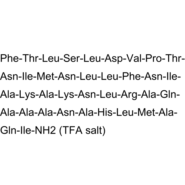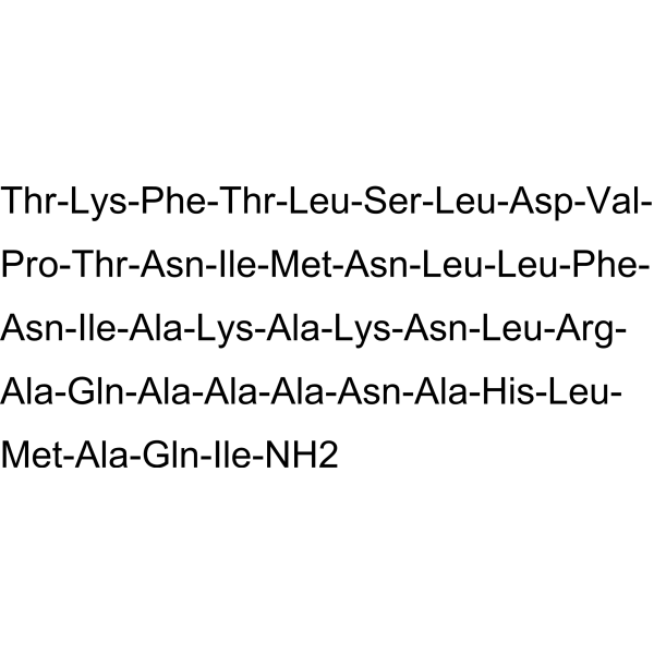 注射用配方1: DMSO : Tween 80: Saline = 10 : 5 : 85 (如: 100 μL DMSO → 50 μL Tween 80 → 850 μL Saline)(IP/IV/IM/SC等) *生理盐水/Saline的制备:将0.9g氯化钠/NaCl溶解在100 mL ddH ₂ O中,得到澄清溶液。 注射用配方 2: DMSO : PEG300 :Tween 80 : Saline = 10 : 40 : 5 : 45 (如: 100 μL DMSO → 400 μL PEG300 → 50 μL Tween 80 → 450 μL Saline) 注射用配方 3: DMSO : Corn oil = 10 : 90 (如: 100 μL DMSO → 900 μL Corn oil) 示例: 以注射用配方 3 (DMSO : Corn oil = 10 : 90) 为例说明, 如果要配制 1 mL 2.5 mg/mL的工作液, 您可以取 100 μL 25 mg/mL 澄清的 DMSO 储备液,加到 900 μL Corn oil/玉米油中, 混合均匀。 View More