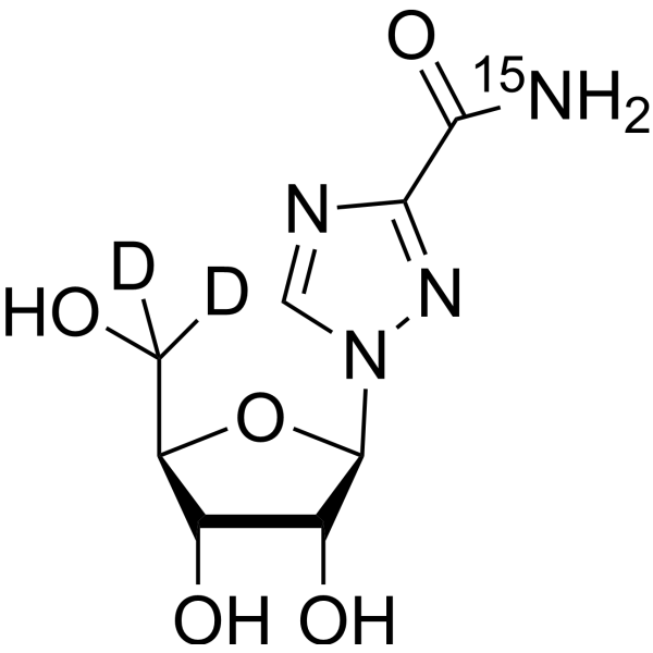 氢、碳和其他元素的稳定重同位素已被整合到药物分子中,主要作为药物开发过程中定量的示踪剂。涉及人类使用氘标记药物的研究表明,与相应的未氘标记的药物相比,这些化合物可能具有某些优势。氘代药物因其可能影响药物的药代动力学和代谢特征而引起关注。Deuttetrabenazine是第一种获得美国食品药品监督管理局批准的氘代药物。Deuttetrabenazine适用于治疗与亨廷顿舞蹈症相关的舞蹈病以及迟发性运动障碍。正在进行的临床试验表明,许多其他氘化化合物正在被评估用于治疗人类疾病,而不仅仅是作为研究工具。[1]。 用 5、10 和 20 μM Ribavirin (ICN-1229) 处理 LPS 刺激的小胶质细胞可诱导 NO2 水平降低 43% (p<0.05)、53% (p<0.05) 和 59 % (p < 0.05)。Ribavirin (ICN-1229) (10 mM) 在非刺激培养物中不显著降低细胞表面积,但在 LPS 刺激的小胶质细胞中显著降低细胞表面积 (32%,p<0.05)[4]。Ribavirin (ICN-1229) 对 DENV 具有活性,在 A549 细胞中的 EC50 为 3 μM,CM-10-18 与 Ribavirin (ICN-1229) 的组合在减少病毒复制[5]。