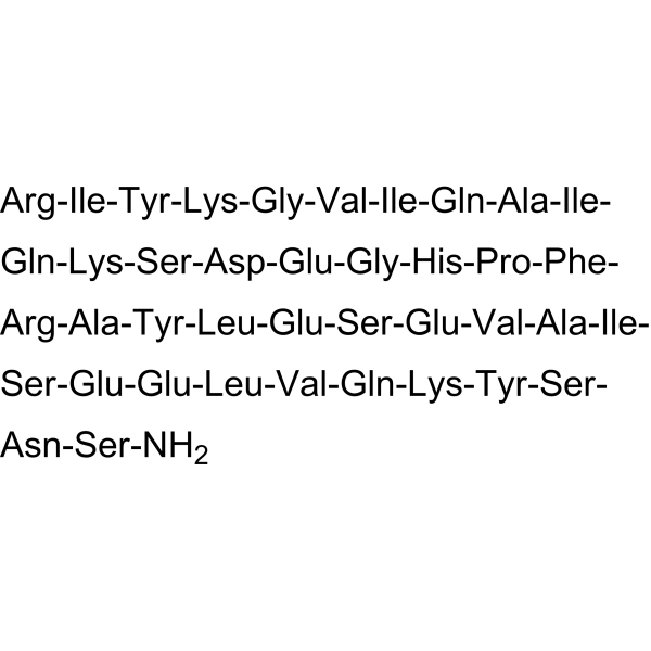 口服配方 3: 溶解于 PEG400 (聚乙二醇400) 请根据您的实验动物和给药方式选择适当的溶解配方/方案: 1、请先配制澄清的储备液(如:用DMSO配置50 或 100 mg/mL母液(储备液)); 2、取适量母液,按从左到右的顺序依次添加助溶剂,澄清后再加入下一助溶剂。以 下列配方为例说明 (注意此配方只用于说明,并不一定代表此产品 的实际溶解配方): 10% DMSO → 40% PEG300 → 5% Tween-80 → 45% ddH2O (或 saline); 假设最终工作液的体积为 1 mL, 浓度为5 mg/mL: 取 100 μL 50 mg/mL 的澄清 DMSO 储备液加到 400 μL PEG300 中,混合均匀/澄清;向上述体系中加入50 μL Tween-80,混合均匀/澄清;然后继续加入450 μL ddH2O (或 saline)定容至 1 mL; 3、溶剂前显示的百分比是指该溶剂在最终溶液/工作液中的体积所占比例; 4、 如产品在配制过程中出现沉淀/析出,可通过加热(≤50℃)或超声的方式助溶; 5、为保证最佳实验结果,工作液请现配现用! 6、如不确定怎么将母液配置成体内动物实验的工作液,请查看说明书或联系我们; 7、 以上所有助溶剂都可在 Invivochem.cn网站购买。 |
