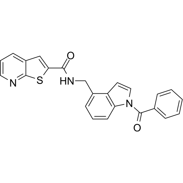 口服配方 3: 溶解于 PEG400 (聚乙二醇400) 请根据您的实验动物和给药方式选择适当的溶解配方/方案: 1、请先配制澄清的储备液(如:用DMSO配置50 或 100 mg/mL母液(储备液)); 2、取适量母液,按从左到右的顺序依次添加助溶剂,澄清后再加入下一助溶剂。以 下列配方为例说明 (注意此配方只用于说明,并不一定代表此产品 的实际溶解配方): 10% DMSO → 40% PEG300 → 5% Tween-80 → 45% ddH2O (或 saline); 假设最终工作液的体积为 1 mL, 浓度为5 mg/mL: 取 100 μL 50 mg/mL 的澄清 DMSO 储备液加到 400 μL PEG300 中,混合均匀/澄清;向上述体系中加入50 μL Tween-80,混合均匀/澄清;然后继续加入450 μL ddH2O (或 saline)定容至 1 mL; 3、溶剂前显示的百分比是指该溶剂在最终溶液/工作液中的体积所占比例; 4、 如产品在配制过程中出现沉淀/析出,可通过加热(≤50℃)或超声的方式助溶; 5、为保证最佳实验结果,工作液请现配现用! 6、如不确定怎么将母液配置成体内动物实验的工作液,请查看说明书或联系我们; 7、 以上所有助溶剂都可在 Invivochem.cn网站购买。 |