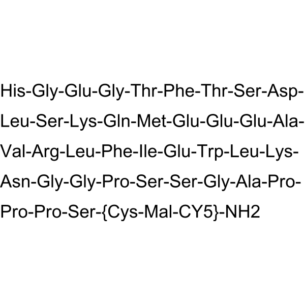 His-Gly-Glu-Gly-Thr-Phe-Thr-Ser-Asp-Leu-Ser-Lys-Gln-Met-Glu-Glu-Glu-Ala-Val-Arg-Leu-Phe-Ile-Glu-Trp-Leu-Lys-Asn-Gly-Gly-Pro-Ser-Ser-Gly-Ala-Pro-Pro-Pro-Ser-{Cys-Mal-CY5}-NH2HGEGTFTSDLSKQMEEEAVRLFIEWLKNGGPSSGAPPPS-{Cys-Mal-CY5}-NH2