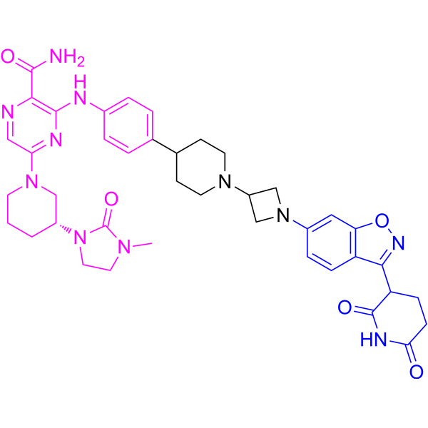 PROTAC BTK/IKZF1/3 降解剂-1(化合物 BT6)(1-300 nM,24 小时)在 Mino 细胞、OCI-ly10 和其他弥漫性大 B 细胞淋巴瘤 (DLBCL) 细胞中显示出浓度依赖性的 BTK 和 IKZF1/3 蛋白降解(BTK 降解率在 33.3 nM 时超过 75%,IKZF1/3 降解率在 300 nM 时超过 50%)[1]。