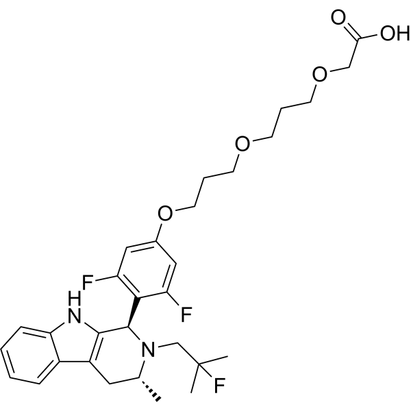 口服配方 3: 溶解于 PEG400 (聚乙二醇400) 请根据您的实验动物和给药方式选择适当的溶解配方/方案: 1、请先配制澄清的储备液(如:用DMSO配置50 或 100 mg/mL母液(储备液)); 2、取适量母液,按从左到右的顺序依次添加助溶剂,澄清后再加入下一助溶剂。以 下列配方为例说明 (注意此配方只用于说明,并不一定代表此产品 的实际溶解配方): 10% DMSO → 40% PEG300 → 5% Tween-80 → 45% ddH2O (或 saline); 假设最终工作液的体积为 1 mL, 浓度为5 mg/mL: 取 100 μL 50 mg/mL 的澄清 DMSO 储备液加到 400 μL PEG300 中,混合均匀/澄清;向上述体系中加入50 μL Tween-80,混合均匀/澄清;然后继续加入450 μL ddH2O (或 saline)定容至 1 mL; 3、溶剂前显示的百分比是指该溶剂在最终溶液/工作液中的体积所占比例; 4、 如产品在配制过程中出现沉淀/析出,可通过加热(≤50℃)或超声的方式助溶; 5、为保证最佳实验结果,工作液请现配现用! 6、如不确定怎么将母液配置成体内动物实验的工作液,请查看说明书或联系我们; 7、 以上所有助溶剂都可在 Invivochem.cn网站购买。 |