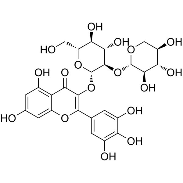 在成熟的 3T3-L1 细胞中,杨梅素-3-O-β-D-木吡喃糖基-(1→2)-β-D-吡喃葡萄糖苷(30 μM,14 天)对 TG 和 FFA 积累表现出抑制活性[2]。 PPARγ、CEBP/α 和 ap2 mRNA 表达被杨梅素-3-O-β-D-吡喃木糖基-(1→2)-β-D-吡喃葡萄糖苷(30 μM,14 天)下调[2]。
