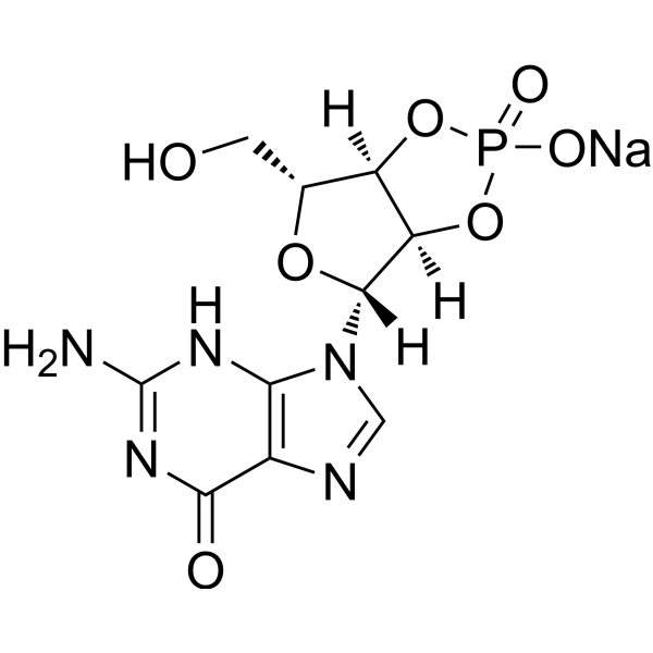 2',3'-cGMP 钠(10 nM-100 μM,120 分钟)会降低人红细胞主动将 [3H]3',5'-cGMP 转移到由内而外的囊泡中的速率[2]。 2',3'-cGMP 钠 (2 μM) 会增加 ATP 酶活性[2]。