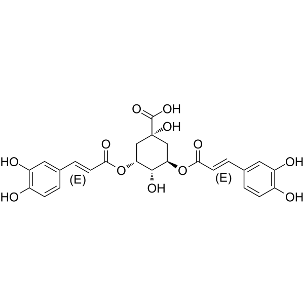 3,5-二-O-咖啡酰奎宁酸是一种羧酸酯,是由(-)-奎宁酸3位和5位的羟基与反式咖啡酸的羧基缩合而成的二酯。它从巴西蜂胶和碱蓬(Suaeda glauca)中分离得到,具有保肝和细胞毒活性。它可作为代谢产物、保肝剂和抗肿瘤剂发挥作用。它是一种环醇羧酸和羧酸酯。其功能与(-)-奎宁酸和反式咖啡酸相关。