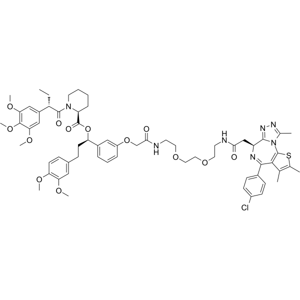 CC[C@@H](C1=CC(=C(C(=C1)OC)OC)OC)C(=O)N2CCCC[C@H]2C(=O)O[C@H](CCC3=CC(=C(C=C3)OC)OC)C4=CC(=CC=C4)OCC(=O)NCCOCCOCCNC(=O)C[C@H]5C6=NN=C(N6C7=C(C(=C(S7)C)C)C(=N5)C8=CC=C(C=C8)Cl)C