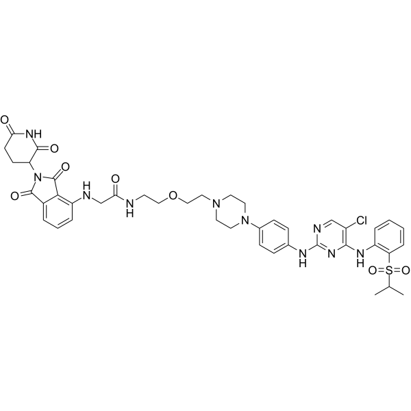 例如,若需制备1 mL的工作液,可将100 μL 50.0 mg/mL澄清DMSO储备液加入400 μL PEG300中,混匀;然后向上述溶液中加入50 μL Tween-80,混匀;加入450 μL生理盐水定容至1 mL。 *生理盐水的制备:将 0.9 g 氯化钠溶解在 100 mL ddH₂O中,得到澄清溶液。 配方 2 中的溶解度: 5 mg/mL (5.63 mM) in 10% DMSO + 90% (20% SBE-β-CD in Saline) (这些助溶剂从左到右依次添加,逐一添加), 悬浊液; 超声助溶。 例如,若需制备1 mL的工作液,可将 100 μL 50.0 mg/mL澄清DMSO储备液加入900 μL 20% SBE-β-CD生理盐水溶液中,混匀。 *20% SBE-β-CD 生理盐水溶液的制备(4°C,1 周):将 2 g SBE-β-CD 溶解于 10 mL 生理盐水中,得到澄清溶液。 请根据您的实验动物和给药方式选择适当的溶解配方/方案: 1、请先配制澄清的储备液(如:用DMSO配置50 或 100 mg/mL母液(储备液)); 2、取适量母液,按从左到右的顺序依次添加助溶剂,澄清后再加入下一助溶剂。以 下列配方为例说明 (注意此配方只用于说明,并不一定代表此产品 的实际溶解配方): 10% DMSO → 40% PEG300 → 5% Tween-80 → 45% ddH2O (或 saline); 假设最终工作液的体积为 1 mL, 浓度为5 mg/mL: 取 100 μL 50 mg/mL 的澄清 DMSO 储备液加到 400 μL PEG300 中,混合均匀/澄清;向上述体系中加入50 μL Tween-80,混合均匀/澄清;然后继续加入450 μL ddH2O (或 saline)定容至 1 mL; 3、溶剂前显示的百分比是指该溶剂在最终溶液/工作液中的体积所占比例; 4、 如产品在配制过程中出现沉淀/析出,可通过加热(≤50℃)或超声的方式助溶; 5、为保证最佳实验结果,工作液请现配现用! 6、如不确定怎么将母液配置成体内动物实验的工作液,请查看说明书或联系我们; 7、 以上所有助溶剂都可在 Invivochem.cn网站购买。 |