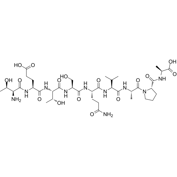 注射用配方1: DMSO : Tween 80: Saline = 10 : 5 : 85 (如: 100 μL DMSO → 50 μL Tween 80 → 850 μL Saline)(IP/IV/IM/SC等) *生理盐水/Saline的制备:将0.9g氯化钠/NaCl溶解在100 mL ddH ₂ O中,得到澄清溶液。 注射用配方 2: DMSO : PEG300 :Tween 80 : Saline = 10 : 40 : 5 : 45 (如: 100 μL DMSO → 400 μL PEG300 → 50 μL Tween 80 → 450 μL Saline) 注射用配方 3: DMSO : Corn oil = 10 : 90 (如: 100 μL DMSO → 900 μL Corn oil) 示例: 以注射用配方 3 (DMSO : Corn oil = 10 : 90) 为例说明, 如果要配制 1 mL 2.5 mg/mL的工作液, 您可以取 100 μL 25 mg/mL 澄清的 DMSO 储备液,加到 900 μL Corn oil/玉米油中, 混合均匀。 View More