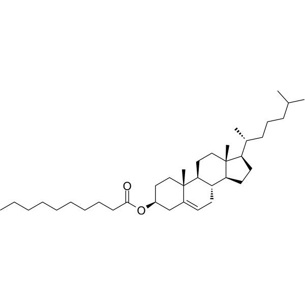 癸酸胆固醇酯是胆固醇的酯类。胆固醇的脂肪酸酯约占血浆中胆固醇的三分之二。胆固醇是一种甾醇(类固醇和醇的结合物)和脂质,存在于所有身体组织的细胞膜中,并在所有动物的血浆中运输。胆固醇酯在动脉内膜(动脉的最内层,与流动的血液直接接触)中的积聚是动脉粥样硬化的特征。动脉粥样硬化是一种影响动脉血管的疾病。它是动脉壁的慢性炎症反应,主要由脂蛋白(携带胆固醇和甘油三酯的血浆蛋白)的沉积引起。胆固醇酯是由胆固醇与长链脂肪酸酯化形成的,一方面,它是胆固醇通过脂蛋白在血液中运输的途径;另一方面,它也是胆固醇本身在细胞内积累的途径。(A7838)。 另见:癸酸(注释已移至)。 |