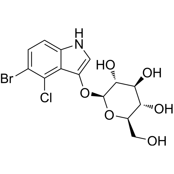 5-溴-4-氯-3-吲哚基β-D-葡萄糖苷是一种吲哚基糖,它是3-羟基-1H-吲哚的β-D-葡萄糖苷,其中吲哚部分在4位和5位分别被氯和溴取代。它可用于检测β-葡萄糖苷酶的存在,该酶能水解糖苷键生成5-溴-4-氯-3-羟基-1H-吲哚,后者立即二聚化生成深蓝色产物。它是一种显色化合物。它是一种吲哚基糖、有机溴化合物、有机氯化合物、D-醛糖衍生物和β-D-葡萄糖苷。它在功能上与吲哚酚相关。