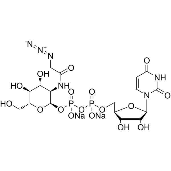 GlcNAc 激酶 (GNK) 测定: 将酶与不同浓度的 GlcNAc 或 GlcNAz 孵育。测定的动力学参数为:对于 GlcNAc,Km 为 50 ± 10 μM,Vmax/[E]t 为 1.5 ± 0.1 μmol•min⁻¹•mg⁻¹;对于 GlcNAz,Km 为 210 ± 40 μM,Vmax/[E]t 为 2.2 ± 0.1 μmol•min⁻¹•mg⁻¹。[1] AGM1 测定: 用 GlcNAc-6-P 或 GlcNAz-6-P 测定酶活性。对于 GlcNAc-6-P,Km 为 30 ± 10 μM,Vmax/[E]t 为 0.12 ± 0.01 μmol•min⁻¹•mg⁻¹;对于 GlcNAz-6-P,Km 为 120 ± 20 μM,Vmax/[E]t 为 0.13 ± 0.01 μmol•min⁻¹•mg⁻¹。[1] UDP-GlcNAc 焦磷酸化酶 (AGX1) 测定: 用 GlcNAc-1-P 或 GlcNAz-1-P 测试酶。对于 GlcNAc-1-P,Km 为 200 ± 50 μM,Vmax/[E]t 为 1.00 ± 0.05 μmol•min⁻¹•mg⁻¹;对于 GlcNAz-1-P,Km 为 700 ± 90 μM,Vmax/[E]t 为 0.90 ± 0.03 μmol•min⁻¹•mg⁻¹。[1] O-GlcNAcase 测定: 为了确定 O-GlcNAcase 对叠氮基团的耐受性,使用对硝基苯基糖苷进行了显色测定。将酶与 pNP-GlcNAc 或 pNP-GlcNAz 孵育,通过分光光度法监测对硝基苯酚的释放。对于 pNP-GlcNAc,Km 为 1,500 ± 100 μM,Vmax/[E]t 为 0.77 ± 0.01 μmol•min⁻¹•mg⁻¹。对于 pNP-GlcNAz,Km 为 1,100 ± 100 μM,Vmax/[E]t 为 0.36 ± 0.01 μmol•min⁻¹•mg⁻¹。[1] 使用 UDP-GlcNAz 的体外 OGTase 活性测定: 将重组 OGTase 与重组 p62 在含有 Tris (pH 7.5)、12.5 mM MgCl₂ 和 1 mM 2-巯基乙醇的缓冲液中,并加入 UDP-GlcNAz 或 UDP-GlcNAc,室温孵育过夜。稀释后,混合物与生物素-膦探针(终浓度 1 mM,溶于 20% 二甲基甲酰胺)在 37°C 反应 1.5-2 小时。随后通过 SDS-PAGE 和 Western blot 分析样品,使用链霉亲和素-HRP 进行检测。[1] Ni-NTA 微孔板 OGT 测定: 开发了一种使用 UDP-GlcNAz 的高通量测定法。将 6×His 标记的底物蛋白(如 Nup62 或 CKII-α)固定在 Ni-NTA 包被的 96 孔板上。封闭后,加入 OGT 酶(来自细菌裂解液或部分纯化)和 UDP-GlcNAz 的反应缓冲液进行孵育(例如抑制研究中在 37°C 孵育 25 分钟)。转移的叠氮基团随后通过铜催化的点击化学反应与 TAMRA-炔烃,或通过 Staudinger 连接反应与生物素-膦反应。洗涤后,用偶联了荧光基团(如 IRDye800CW)的相应抗体(如抗 TAMRA 抗体)检测结合的探针,并使用红外成像系统进行定量。[2] |