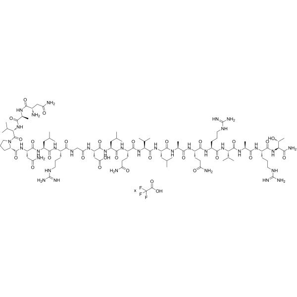 注射用配方1: DMSO : Tween 80: Saline = 10 : 5 : 85 (如: 100 μL DMSO → 50 μL Tween 80 → 850 μL Saline)(IP/IV/IM/SC等) *生理盐水/Saline的制备:将0.9g氯化钠/NaCl溶解在100 mL ddH ₂ O中,得到澄清溶液。 注射用配方 2: DMSO : PEG300 :Tween 80 : Saline = 10 : 40 : 5 : 45 (如: 100 μL DMSO → 400 μL PEG300 → 50 μL Tween 80 → 450 μL Saline) 注射用配方 3: DMSO : Corn oil = 10 : 90 (如: 100 μL DMSO → 900 μL Corn oil) 示例: 以注射用配方 3 (DMSO : Corn oil = 10 : 90) 为例说明, 如果要配制 1 mL 2.5 mg/mL的工作液, 您可以取 100 μL 25 mg/mL 澄清的 DMSO 储备液,加到 900 μL Corn oil/玉米油中, 混合均匀。 View More