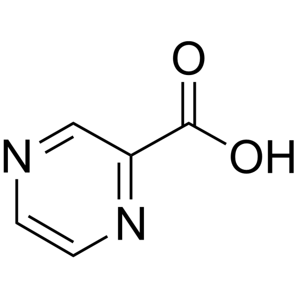 吡嗪甲酸是吡嗪酰胺的活性代谢物。抗结核病的药物是吡嗪酰胺。在用于评估促尿酸排泄药物作用的模型中,丙磺舒减少了吡嗪甲酸的尿液排泄,表明尿酸盐和吡嗪甲酸排泄之间存在负相关。体外实验表明,吡嗪甲酸刺激大鼠肾刷状缘膜中的囊泡可促进尿酸盐吸收,而促尿酸排泄药物可阻止尿酸盐吸收。植物细胞使用 PZA(吡嗪酰胺)将其转化为 POA(吡嗪羧酸),后者会抑制 1-氨基环丙烷-1-羧酸氧化酶 (ACO) 的作用,该酶催化乙烯生产的最后一步。