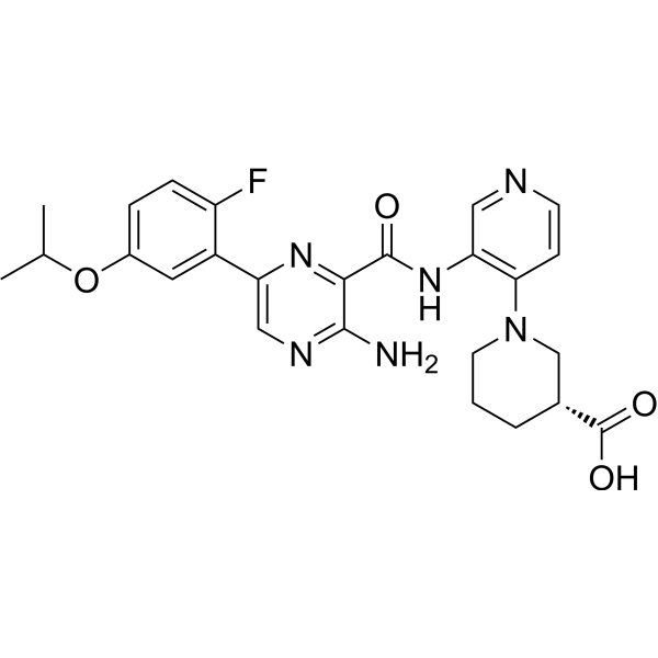 InChI=1S/C25H27FN6O4/c1-14(2)36-16-5-6-18(26)17(10-16)19-12-29-23(27)22(30-19)24(33)31-20-11-28-8-7-21(20)32-9-3-4-15(13-32)25(34)35/h5-8,10-12,14-15H,3-4,9,13H2,1-2H3,(H2,27,29)(H,31,33)(H,34,35)/t15-/m1/s1
