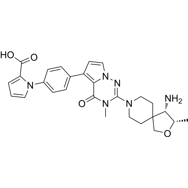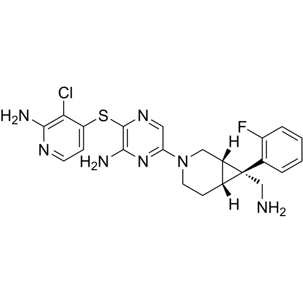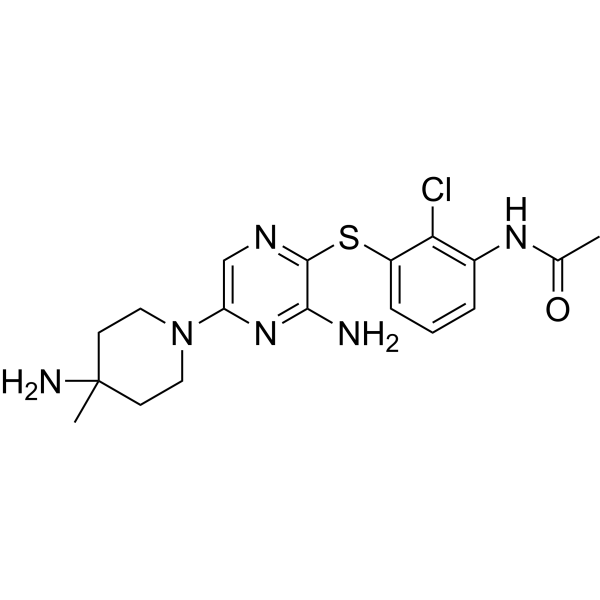 SHP2抑制剂PF-07284892是一种小分子蛋白酪氨酸磷酸酶(PTP)非受体型11(SHP2;Src同源区2结构域磷酸酶;PTPN11)抑制剂,具有潜在的抗肿瘤活性。给药后,SHP2抑制剂PF-07284892靶向结合并抑制SHP2的活性。这可阻断SHP2介导的信号传导,抑制MAPK信号传导,并抑制表达SHP2的肿瘤细胞的生长。SHP2是一种在多种癌细胞类型中过度表达的癌蛋白,它通过激活Ras-Raf-MEK-ERK信号通路来调节细胞存活、分化和增殖。由于特定的突变和重排,Ras-MAPK通路在癌细胞中通常过度激活,并且其致癌信号传导依赖于SHP2。 SHP2 还调节程序性细胞死亡 1 (PD-1) 介导的信号转导,并参与免疫检查点调节。