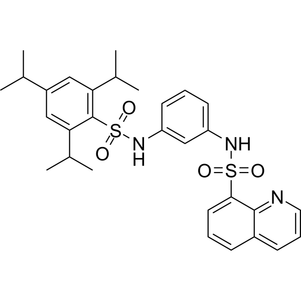 例如,若需制备1 mL的工作液,可将100 μL 25.0 mg/mL澄清DMSO储备液加入到400 μL PEG300中,混匀;然后向上述溶液中加入50 μL Tween-80,混匀;加入450 μL生理盐水定容至1 mL。 *生理盐水的制备:将 0.9 g 氯化钠溶解在 100 mL ddH₂O中,得到澄清溶液。 配方 2 中的溶解度: 2.5 mg/mL (4.42 mM) in 10% DMSO + 90% Corn Oil (这些助溶剂从左到右依次添加,逐一添加), 悬浊液; 超声助溶。 例如,若需制备1 mL的工作液,可将 100 μL 25.0 mg/mL 澄清 DMSO 储备液加入到 900 μL 玉米油中并混合均匀。 请根据您的实验动物和给药方式选择适当的溶解配方/方案: 1、请先配制澄清的储备液(如:用DMSO配置50 或 100 mg/mL母液(储备液)); 2、取适量母液,按从左到右的顺序依次添加助溶剂,澄清后再加入下一助溶剂。以 下列配方为例说明 (注意此配方只用于说明,并不一定代表此产品 的实际溶解配方): 10% DMSO → 40% PEG300 → 5% Tween-80 → 45% ddH2O (或 saline); 假设最终工作液的体积为 1 mL, 浓度为5 mg/mL: 取 100 μL 50 mg/mL 的澄清 DMSO 储备液加到 400 μL PEG300 中,混合均匀/澄清;向上述体系中加入50 μL Tween-80,混合均匀/澄清;然后继续加入450 μL ddH2O (或 saline)定容至 1 mL; 3、溶剂前显示的百分比是指该溶剂在最终溶液/工作液中的体积所占比例; 4、 如产品在配制过程中出现沉淀/析出,可通过加热(≤50℃)或超声的方式助溶; 5、为保证最佳实验结果,工作液请现配现用! 6、如不确定怎么将母液配置成体内动物实验的工作液,请查看说明书或联系我们; 7、 以上所有助溶剂都可在 Invivochem.cn网站购买。 |
