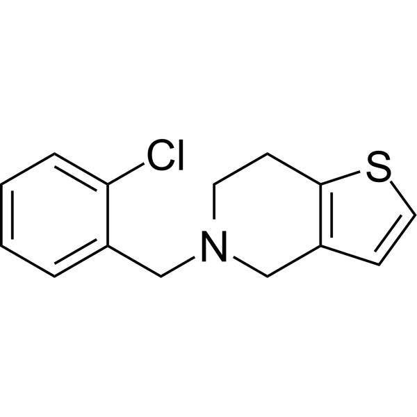 Doses: 4 or 10 mg/kg Route of Administration: Orally administered 30 min before oral administration of losartan. Experimental Results: The AUC and Cmax of Losartan after oral administration with Losartan and 10 mg/kg Ticlopidine were Dramatically greater (by 65.0% and 49.4%, respectively) than those of control rats. Oral and intravenous administrations of losartan and Ticlopidine [3] Losartan was orally or intravenously administrated, whereas ticlopidine was administrated orally. Oral losartan and ticlopidine were dissolved in distilled water (5 and 4 mL, respectively). Intravenous losartan was dissolved in 0.9% NaCl solution (4 mL). The rats were randomly divided into six groups (n=6 each): oral losartan (9 mg/kg) without and with oral ticlopidine (4 or 10 mg/kg); intravenous losartan (3 mg/kg) without and with oral ticlopidine (4 or 10 mg/kg). The rats were fasted for at least 24 h prior to the beginning of the experiments. Each animal was anaesthetized with light ether and the right femoral artery (for blood sampling) or vein (for iv administration of losartan) was cannulated with a polyethylene tube (SP45, ID 0.58 mm, OD 0.96 mm). Ticlopidine was orally administered 30 min before oral administration of losartan. Oral losartan and ticlopidine were administered using a gastric gavage tube. A blood sample (approximately 0.5 mL) was collected into a heparinized tube at 0 (control), 0.017 (end of the infusion), 0.1, 0.25, 0.5, 1, 2, 4, 8, and 12 h after iv administration, and 0, 0.1, 0.25, 0.5, 1, 2, 4, 6, 8, and 12 h after oral administration. Approximately 1 mL of whole blood collected from untreated rats was infused via the femoral artery at 0.25, 1, and 4 h to replace the blood loss due to blood sampling. Each blood sample was centrifuged at 16 810×g for 5 min, and 200 μL of each plasma sample was stored at -40 °C until HPLC analysis of losartan and EXP-3174 was performed. |