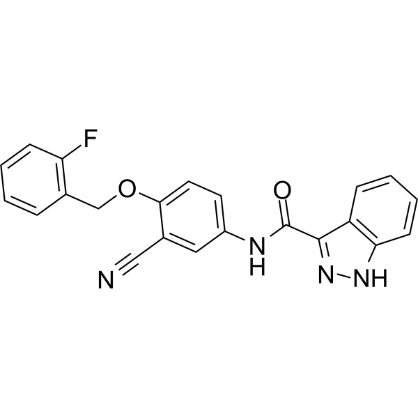 口服配方 1: 悬浮于0.5% CMC Na (羧甲基纤维素钠) 口服配方 2: 悬浮于0.5% Carboxymethyl cellulose (羧甲基纤维素) 示例: 以口服配方 1 (悬浮于 0.5% CMC Na)为例说明, 如果要配制 100 mL 2.5 mg/mL 的工作液, 您可以先取0.5g CMC Na并将其溶解于100mL ddH2O中,得到0.5%CMC-Na澄清溶液;然后将250 mg待测化合物加到100 mL前述 0.5%CMC Na溶液中,得到悬浮液。 View More