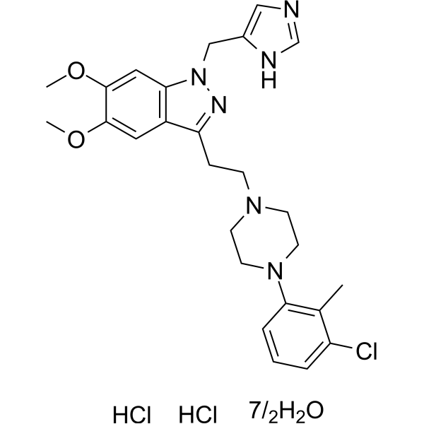 注射用配方1: DMSO : Tween 80: Saline = 10 : 5 : 85 (如: 100 μL DMSO → 50 μL Tween 80 → 850 μL Saline)(IP/IV/IM/SC等) *生理盐水/Saline的制备:将0.9g氯化钠/NaCl溶解在100 mL ddH ₂ O中,得到澄清溶液。 注射用配方 2: DMSO : PEG300 :Tween 80 : Saline = 10 : 40 : 5 : 45 (如: 100 μL DMSO → 400 μL PEG300 → 50 μL Tween 80 → 450 μL Saline) 注射用配方 3: DMSO : Corn oil = 10 : 90 (如: 100 μL DMSO → 900 μL Corn oil) 示例: 以注射用配方 3 (DMSO : Corn oil = 10 : 90) 为例说明, 如果要配制 1 mL 2.5 mg/mL的工作液, 您可以取 100 μL 25 mg/mL 澄清的 DMSO 储备液,加到 900 μL Corn oil/玉米油中, 混合均匀。 View More