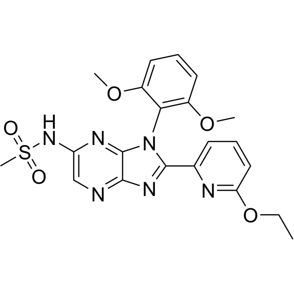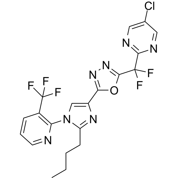 BMS-986224 对人 APJ 的 EC50 为 0.02 nM,并完全阻断毛喉素介导的 cAMP 合成。中国仓鼠卵巢-K1 或 HEK293 ZF 细胞在 β-arrestin 募集、ERK 磷酸化和 APJ 内化方面对 BMS-986224 (0-100 nM) 完全响应[1]。强效选择性 APJ 受体激动剂 BMS-986224 显示出类似于 (Pyr1) apelin-13[1] 的信号传导谱。