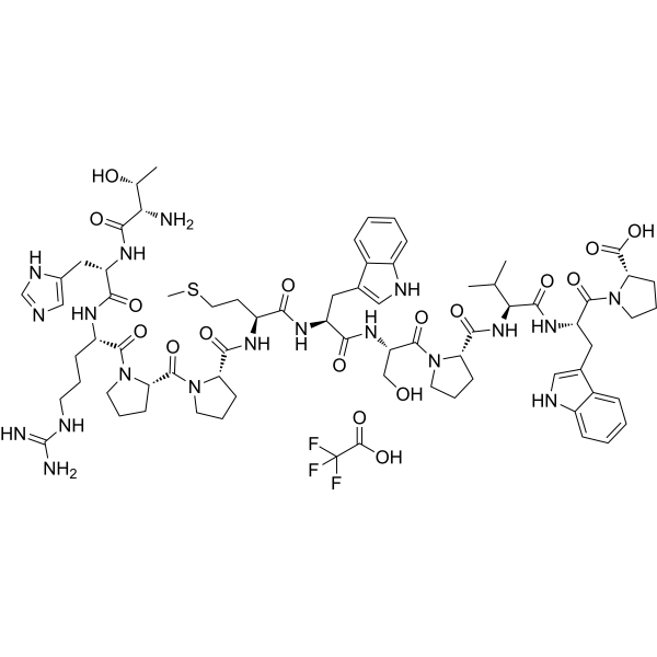注射用配方1: DMSO : Tween 80: Saline = 10 : 5 : 85 (如: 100 μL DMSO → 50 μL Tween 80 → 850 μL Saline)(IP/IV/IM/SC等) *生理盐水/Saline的制备:将0.9g氯化钠/NaCl溶解在100 mL ddH ₂ O中,得到澄清溶液。 注射用配方 2: DMSO : PEG300 :Tween 80 : Saline = 10 : 40 : 5 : 45 (如: 100 μL DMSO → 400 μL PEG300 → 50 μL Tween 80 → 450 μL Saline) 注射用配方 3: DMSO : Corn oil = 10 : 90 (如: 100 μL DMSO → 900 μL Corn oil) 示例: 以注射用配方 3 (DMSO : Corn oil = 10 : 90) 为例说明, 如果要配制 1 mL 2.5 mg/mL的工作液, 您可以取 100 μL 25 mg/mL 澄清的 DMSO 储备液,加到 900 μL Corn oil/玉米油中, 混合均匀。 View More