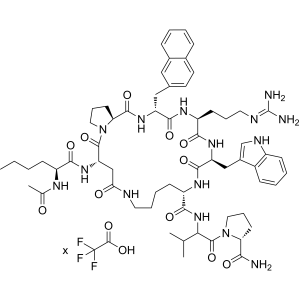 注射用配方1: DMSO : Tween 80: Saline = 10 : 5 : 85 (如: 100 μL DMSO → 50 μL Tween 80 → 850 μL Saline)(IP/IV/IM/SC等) *生理盐水/Saline的制备:将0.9g氯化钠/NaCl溶解在100 mL ddH ₂ O中,得到澄清溶液。 注射用配方 2: DMSO : PEG300 :Tween 80 : Saline = 10 : 40 : 5 : 45 (如: 100 μL DMSO → 400 μL PEG300 → 50 μL Tween 80 → 450 μL Saline) 注射用配方 3: DMSO : Corn oil = 10 : 90 (如: 100 μL DMSO → 900 μL Corn oil) 示例: 以注射用配方 3 (DMSO : Corn oil = 10 : 90) 为例说明, 如果要配制 1 mL 2.5 mg/mL的工作液, 您可以取 100 μL 25 mg/mL 澄清的 DMSO 储备液,加到 900 μL Corn oil/玉米油中, 混合均匀。 View More