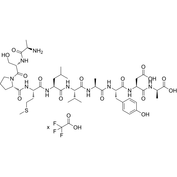 注射用配方1: DMSO : Tween 80: Saline = 10 : 5 : 85 (如: 100 μL DMSO → 50 μL Tween 80 → 850 μL Saline)(IP/IV/IM/SC等) *生理盐水/Saline的制备:将0.9g氯化钠/NaCl溶解在100 mL ddH ₂ O中,得到澄清溶液。 注射用配方 2: DMSO : PEG300 :Tween 80 : Saline = 10 : 40 : 5 : 45 (如: 100 μL DMSO → 400 μL PEG300 → 50 μL Tween 80 → 450 μL Saline) 注射用配方 3: DMSO : Corn oil = 10 : 90 (如: 100 μL DMSO → 900 μL Corn oil) 示例: 以注射用配方 3 (DMSO : Corn oil = 10 : 90) 为例说明, 如果要配制 1 mL 2.5 mg/mL的工作液, 您可以取 100 μL 25 mg/mL 澄清的 DMSO 储备液,加到 900 μL Corn oil/玉米油中, 混合均匀。 View More