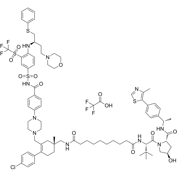PZ703b(0-1 μM, 24 h) TFA可能通过线粒体途径导致膀胱癌细胞凋亡,并可以与Mivebresib协同作用,以剂量依赖性方式减少膀胱癌细胞增殖[1]。 PZ703b(0-1 μM, 48 h) TFA 抑制 MOLT-4 和 RS4;11 细胞,IC50 值分别为 15.9 和 11.3 nM[2]。利用 caspase-3 介导的机制,PZ703b(10 nM, 48 h)TFA 导致 MOLT-4 细胞中的 BCL-XL 降解和死亡,快速且持久[2]。
