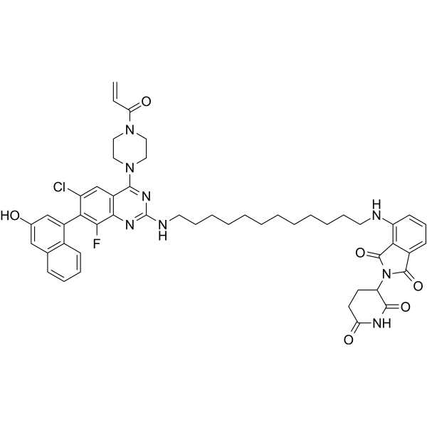 化合物 10(PROTAC KRAS G12C degrader-1)在体外结合 KRASG12C,在细胞中结合 CRBN。然后,它会引起 CRBN/KRASG12C 二聚化,并以 CRBN 依赖性方式降解报告细胞中的 GFP-KRASG12C [1]。
