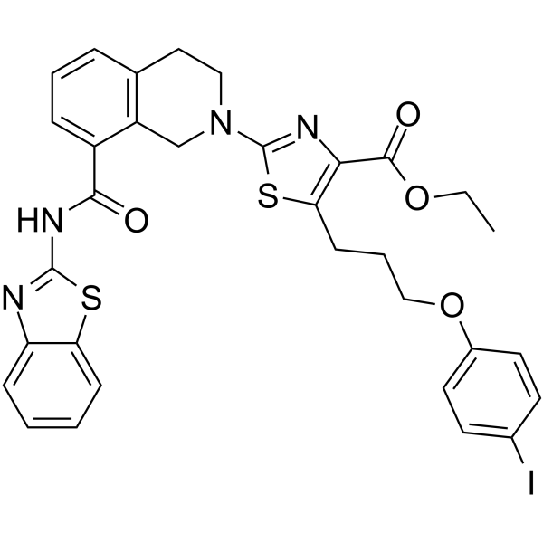 口服配方 3: 溶解于 PEG400 (聚乙二醇400) 请根据您的实验动物和给药方式选择适当的溶解配方/方案: 1、请先配制澄清的储备液(如:用DMSO配置50 或 100 mg/mL母液(储备液)); 2、取适量母液,按从左到右的顺序依次添加助溶剂,澄清后再加入下一助溶剂。以 下列配方为例说明 (注意此配方只用于说明,并不一定代表此产品 的实际溶解配方): 10% DMSO → 40% PEG300 → 5% Tween-80 → 45% ddH2O (或 saline); 假设最终工作液的体积为 1 mL, 浓度为5 mg/mL: 取 100 μL 50 mg/mL 的澄清 DMSO 储备液加到 400 μL PEG300 中,混合均匀/澄清;向上述体系中加入50 μL Tween-80,混合均匀/澄清;然后继续加入450 μL ddH2O (或 saline)定容至 1 mL; 3、溶剂前显示的百分比是指该溶剂在最终溶液/工作液中的体积所占比例; 4、 如产品在配制过程中出现沉淀/析出,可通过加热(≤50℃)或超声的方式助溶; 5、为保证最佳实验结果,工作液请现配现用! 6、如不确定怎么将母液配置成体内动物实验的工作液,请查看说明书或联系我们; 7、 以上所有助溶剂都可在 Invivochem.cn网站购买。 |