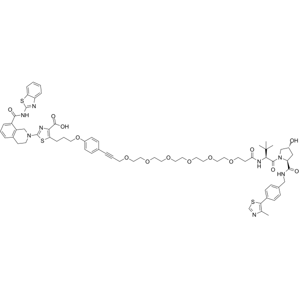 在 THP-1 细胞中,PROTAC Bcl-xL degrader-2(PROTAC 6;0.1 nM–10 μM;24 小时)处理可减少 Bcl-xL 蛋白的量[1]。在 MOLT-4 细胞中,PROTAC Bcl-xL degrader-2 (PROTAC 6) 抑制 caspase 3/7 活性,IC50 为 466 nM[1]。