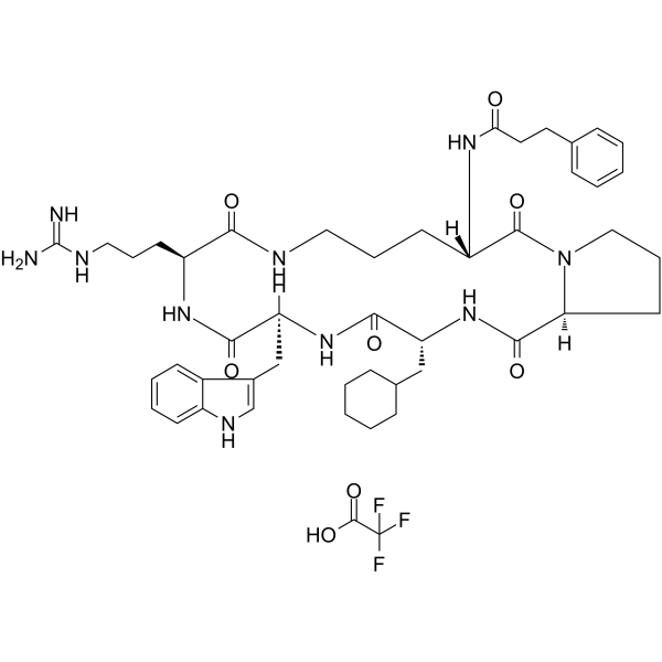 例如,若需制备1 mL的工作液,可将100 μL 25.0 mg/mL澄清DMSO储备液加入到400 μL PEG300中,混匀;然后向上述溶液中加入50 μL Tween-80,混匀;加入450 μL生理盐水定容至1 mL。 *生理盐水的制备:将 0.9 g 氯化钠溶解在 100 mL ddH₂O中,得到澄清溶液。 配方 2 中的溶解度: ≥ 2.5 mg/mL (2.62 mM) (饱和度未知) in 10% DMSO + 90% (20% SBE-β-CD in Saline) (这些助溶剂从左到右依次添加,逐一添加), 澄清溶液。 例如,若需制备1 mL的工作液,可将 100 μL 25.0 mg/mL澄清DMSO储备液加入900 μL 20% SBE-β-CD生理盐水溶液中,混匀。 *20% SBE-β-CD 生理盐水溶液的制备(4°C,1 周):将 2 g SBE-β-CD 溶解于 10 mL 生理盐水中,得到澄清溶液。 View More