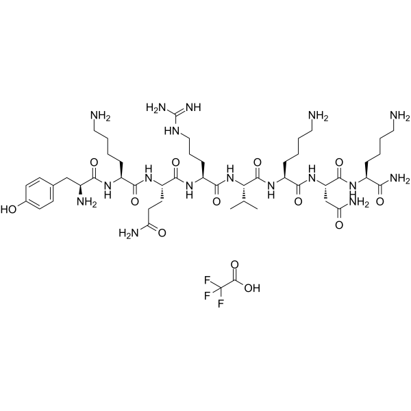 PACAP-38(31–38)、人、小鼠和大鼠 TFA(100 nM;2 分钟;NCI-H838 细胞)酪氨酸磷酸化 EGFR、HER2 和 ERK[1]。使用 PACAP-38(31–38)、人、小鼠和大鼠 TFA(100 nM;30 分钟;NCI-H838 细胞)诱导 EGFR 酪氨酸磷酸化可使 ROS 水平提高 51%[1]。 TFA(10 nM;48 小时)可刺激人、小鼠和大鼠 PACAP-38(31–38)[1] 中的 NCI-H838 细胞生长。人、小鼠和大鼠 TFA(300 nM;4 小时)与 PACAP-38(31–38) 一起增加脑细胞中 APPsα 的产生[2]。通过 cAMP 积累和胞质游离钙增加,PACAP-38(31–38)、人、小鼠和大鼠 TFA(0.01–10 nM;HEK 293 细胞)刺激神经细胞表达内源 PAC1 受体。它还以剂量依赖性方式诱导细胞内 Ca2+ 浓度升高,EC50 值为 0.81 nM[2]。 PACAP-38(31–38)、人、小鼠和大鼠 TFA(0.01 nM;48 小时)以强而有效的方式刺激 SCG 神经元细胞释放 NPY[3]。人、小鼠和大鼠 TFA(100 nM;14 d)与 PACAP-38(31-38) 一起产生延长激活的 NPY 和儿茶酚胺分泌型同情神经元 [3]。