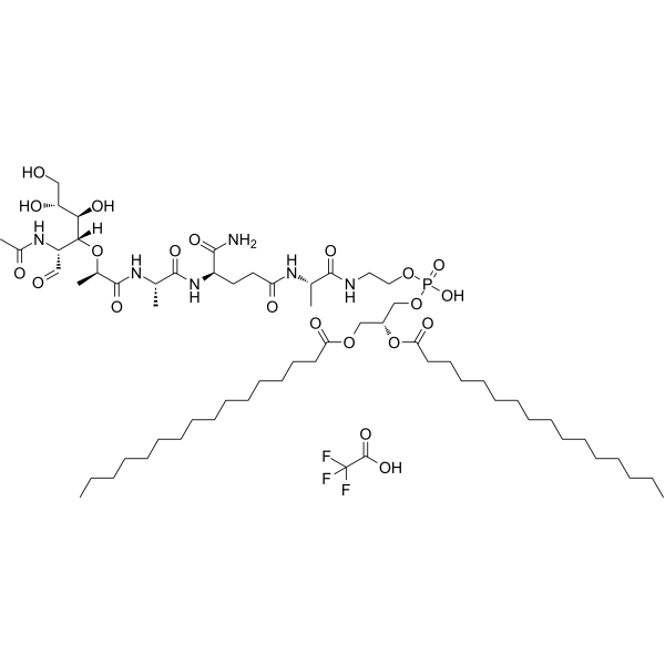 使用 Mifamurtide TFA(MTP-PE TFA;100 µM)与巨噬细胞共培养时,MG63 细胞计数会降低[3]。 100 µM 剂量的 mifamurtide TFA 可增强促炎(IL-1β、IL-6)和抗炎(IL-4、IL-10)细胞因子、iNOS 和 CD206 mRNA,它们是 M1 和 M2 极化的标志物,分别。 DMT1(铁转运蛋白)被米法莫肽 TFA 上调[3]。两种骨肉瘤细胞系 MOS-J 和 KHOS 的体外和体内生长速率不受 L-mifamurtide TFA(5、 5000 nM;持续 48 小时)的直接影响[1]。 TNF-a、白细胞介素 (IL)-1、IL-6、IL-8、IL-12、一氧化氮 (NO)、前列腺素 E2 (PGE2) 和 PGD2 是巨噬细胞和单核细胞分泌的促炎细胞因子,被米法莫肽 TFA 激活,并与杀肿瘤活性的上调有关 [3]。
