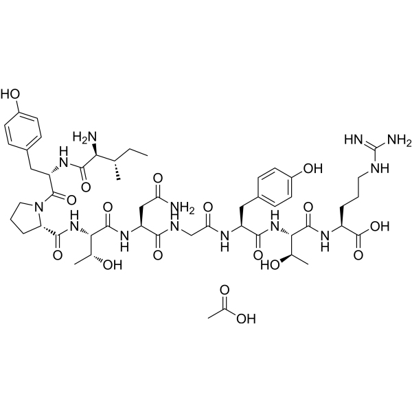 注射用配方1: DMSO : Tween 80: Saline = 10 : 5 : 85 (如: 100 μL DMSO → 50 μL Tween 80 → 850 μL Saline)(IP/IV/IM/SC等) *生理盐水/Saline的制备:将0.9g氯化钠/NaCl溶解在100 mL ddH ₂ O中,得到澄清溶液。 注射用配方 2: DMSO : PEG300 :Tween 80 : Saline = 10 : 40 : 5 : 45 (如: 100 μL DMSO → 400 μL PEG300 → 50 μL Tween 80 → 450 μL Saline) 注射用配方 3: DMSO : Corn oil = 10 : 90 (如: 100 μL DMSO → 900 μL Corn oil) 示例: 以注射用配方 3 (DMSO : Corn oil = 10 : 90) 为例说明, 如果要配制 1 mL 2.5 mg/mL的工作液, 您可以取 100 μL 25 mg/mL 澄清的 DMSO 储备液,加到 900 μL Corn oil/玉米油中, 混合均匀。 View More
