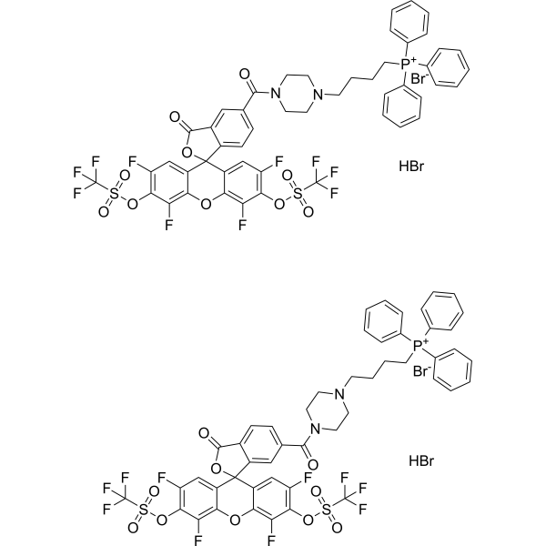 在非常低的激光功率输出情况下,HKSOX-1m(5/6-mixture)氢溴酸盐(10 μM)可以灵敏地捕获分化的人THP-1细胞以及抗霉素A(1 μM)激活的基础信号。 Zeiss LSM 510 Meta 在 514 nm 激发波长处的线粒体 O2 信号(强度为 1%)[1]。 1. HKSOX-1m(5/6-混合物)氢溴酸工作液的配制 1.1 准备好储备液。要获得 10 mM 储备溶液,请用 79 μL 无水 DMSO 稀释 1 毫克 HKSOX-1m(5/6-混合物)氢溴酸盐。建议将 HKSOX-1m(5/6 混合物)氢溴酸盐储存溶液等分并在 -20°C 或 -80°C 避光保存。 1.2 创建功能溶液 使用加热的无血清细胞培养基或 PBS 稀释储备液制备 1-10 μM HKSOX-1m(5/6 混合物)氢溴酸工作溶液。注:HKSOX-1m(5/6混合)氢溴酸工作液请根据实际情况调整浓度配制使用。 2.细胞对悬浮细胞染色 2.1 离心细胞,加入PBS,洗涤两次,每次五分钟。细胞密度为1×106/mL。 2.2 加入1mL氢溴酸盐工作溶液HKSOX-1m(5/6-混合物)并在室温下静置5至30分钟。 2.3 400 g 离心 3-4 分钟,然后去除上清液。 2.4 加入PBS后,洗涤细胞两次,每次5分钟。 2.5 将细胞重悬于1毫升PBS或无血清培养基中,用流式细胞仪或荧光显微镜观察。 3. 细胞内贴壁细胞染色 3.1 使用无菌盖玻片培养贴壁细胞。 3.2 从培养基中取出盖玻片后吸出多余的培养基。 3.3 用100 μL染料工作液完全覆盖细胞,轻轻摇匀,孵育5至30分钟。 3.4 吸干染料工作液并用培养基洗涤两次,每次共5分钟后,用流式细胞仪或荧光显微镜观察。