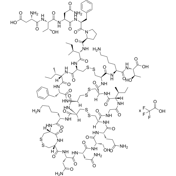 注射用配方1: DMSO : Tween 80: Saline = 10 : 5 : 85 (如: 100 μL DMSO → 50 μL Tween 80 → 850 μL Saline)(IP/IV/IM/SC等) *生理盐水/Saline的制备:将0.9g氯化钠/NaCl溶解在100 mL ddH ₂ O中,得到澄清溶液。 注射用配方 2: DMSO : PEG300 :Tween 80 : Saline = 10 : 40 : 5 : 45 (如: 100 μL DMSO → 400 μL PEG300 → 50 μL Tween 80 → 450 μL Saline) 注射用配方 3: DMSO : Corn oil = 10 : 90 (如: 100 μL DMSO → 900 μL Corn oil) 示例: 以注射用配方 3 (DMSO : Corn oil = 10 : 90) 为例说明, 如果要配制 1 mL 2.5 mg/mL的工作液, 您可以取 100 μL 25 mg/mL 澄清的 DMSO 储备液,加到 900 μL Corn oil/玉米油中, 混合均匀。 View More