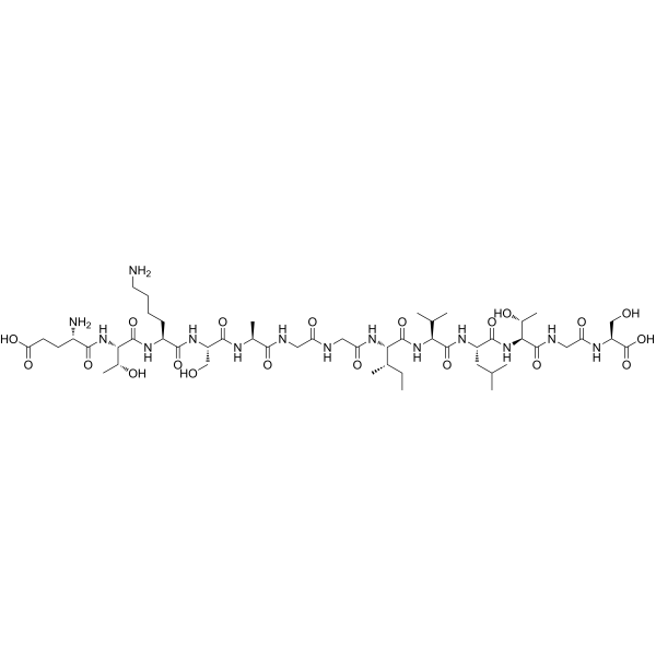 注射用配方1: DMSO : Tween 80: Saline = 10 : 5 : 85 (如: 100 μL DMSO → 50 μL Tween 80 → 850 μL Saline)(IP/IV/IM/SC等) *生理盐水/Saline的制备:将0.9g氯化钠/NaCl溶解在100 mL ddH ₂ O中,得到澄清溶液。 注射用配方 2: DMSO : PEG300 :Tween 80 : Saline = 10 : 40 : 5 : 45 (如: 100 μL DMSO → 400 μL PEG300 → 50 μL Tween 80 → 450 μL Saline) 注射用配方 3: DMSO : Corn oil = 10 : 90 (如: 100 μL DMSO → 900 μL Corn oil) 示例: 以注射用配方 3 (DMSO : Corn oil = 10 : 90) 为例说明, 如果要配制 1 mL 2.5 mg/mL的工作液, 您可以取 100 μL 25 mg/mL 澄清的 DMSO 储备液,加到 900 μL Corn oil/玉米油中, 混合均匀。 View More