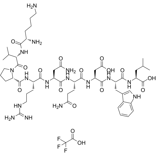 请根据您的实验动物和给药方式选择适当的溶解配方/方案: 1、请先配制澄清的储备液(如:用DMSO配置50 或 100 mg/mL母液(储备液)); 2、取适量母液,按从左到右的顺序依次添加助溶剂,澄清后再加入下一助溶剂。以 下列配方为例说明 (注意此配方只用于说明,并不一定代表此产品 的实际溶解配方): 10% DMSO → 40% PEG300 → 5% Tween-80 → 45% ddH2O (或 saline); 假设最终工作液的体积为 1 mL, 浓度为5 mg/mL: 取 100 μL 50 mg/mL 的澄清 DMSO 储备液加到 400 μL PEG300 中,混合均匀/澄清;向上述体系中加入50 μL Tween-80,混合均匀/澄清;然后继续加入450 μL ddH2O (或 saline)定容至 1 mL; 3、溶剂前显示的百分比是指该溶剂在最终溶液/工作液中的体积所占比例; 4、 如产品在配制过程中出现沉淀/析出,可通过加热(≤50℃)或超声的方式助溶; 5、为保证最佳实验结果,工作液请现配现用! 6、如不确定怎么将母液配置成体内动物实验的工作液,请查看说明书或联系我们; 7、 以上所有助溶剂都可在 Invivochem.cn网站购买。 |