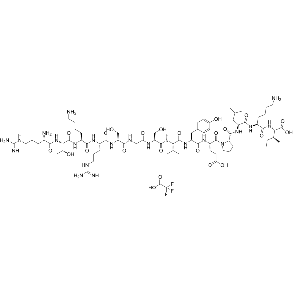 马兰肽对于 PKA 的 Km 值为 15 μM,对于 PKG 的 Km 值为 223 μM。 PKA 和 PKG 的 Vmax 值分别为 23.8 和 6.6 单位/毫克[1]。只有与马兰肽联合使用时,异丙肾上腺素才对豚鼠心脏活动率产生具有统计学意义的影响[1]。