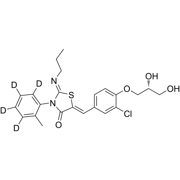 注射用配方1: DMSO : Tween 80: Saline = 10 : 5 : 85 (如: 100 μL DMSO → 50 μL Tween 80 → 850 μL Saline)(IP/IV/IM/SC等) *生理盐水/Saline的制备:将0.9g氯化钠/NaCl溶解在100 mL ddH ₂ O中,得到澄清溶液。 注射用配方 2: DMSO : PEG300 :Tween 80 : Saline = 10 : 40 : 5 : 45 (如: 100 μL DMSO → 400 μL PEG300 → 50 μL Tween 80 → 450 μL Saline) 注射用配方 3: DMSO : Corn oil = 10 : 90 (如: 100 μL DMSO → 900 μL Corn oil) 示例: 以注射用配方 3 (DMSO : Corn oil = 10 : 90) 为例说明, 如果要配制 1 mL 2.5 mg/mL的工作液, 您可以取 100 μL 25 mg/mL 澄清的 DMSO 储备液,加到 900 μL Corn oil/玉米油中, 混合均匀。 View More