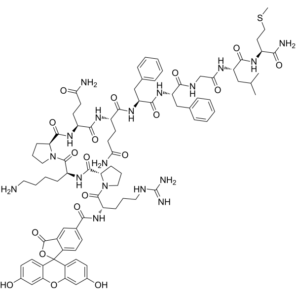 口服配方 3: 溶解于 PEG400 (聚乙二醇400) 请根据您的实验动物和给药方式选择适当的溶解配方/方案: 1、请先配制澄清的储备液(如:用DMSO配置50 或 100 mg/mL母液(储备液)); 2、取适量母液,按从左到右的顺序依次添加助溶剂,澄清后再加入下一助溶剂。以 下列配方为例说明 (注意此配方只用于说明,并不一定代表此产品 的实际溶解配方): 10% DMSO → 40% PEG300 → 5% Tween-80 → 45% ddH2O (或 saline); 假设最终工作液的体积为 1 mL, 浓度为5 mg/mL: 取 100 μL 50 mg/mL 的澄清 DMSO 储备液加到 400 μL PEG300 中,混合均匀/澄清;向上述体系中加入50 μL Tween-80,混合均匀/澄清;然后继续加入450 μL ddH2O (或 saline)定容至 1 mL; 3、溶剂前显示的百分比是指该溶剂在最终溶液/工作液中的体积所占比例; 4、 如产品在配制过程中出现沉淀/析出,可通过加热(≤50℃)或超声的方式助溶; 5、为保证最佳实验结果,工作液请现配现用! 6、如不确定怎么将母液配置成体内动物实验的工作液,请查看说明书或联系我们; 7、 以上所有助溶剂都可在 Invivochem.cn网站购买。 |