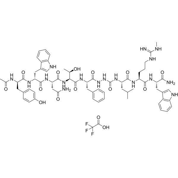 TAK-683(皮下注射;0.008、0.08、0.8 或 8 μmol/ml/kg;每天一次;7 天)增加睾酮和血浆黄体生成素水平;然而,生殖器官重量和血浆激素水平在第 7 天后下降[1]。 TAK-683 是治疗前列腺癌和生殖功能抑制等激素相关疾病的一种有前途的治疗方法。它以 10、30 或 100 pmol/h 的速度皮下注射,每天一次,持续 4 周[1]。在前列腺癌模型中对 TAK-683(皮下注射;2.1–21 nmol/kg/天;每天一次;12 周)进行的长期检查显示,大鼠的血液 PSA 浓度降低,所有大鼠的 PSA 浓度均下降第 14 天时低于检测限 (0.5 ng/ml)[1]。