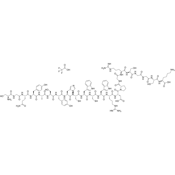 TPP-1 TFA 通过以高亲和力与 PD-L1 结合来抑制 PD-1/PD-L1 相互作用。 TPP-1 TFA 与 PD-L1 的结合位点靠近 PD-1 和 PD-L1 的相互作用位点[1]。 PD-L1 与 TPP-1 TFA 肽的 KD 值约为 95 nmol/L(几乎比 PD-1 小五倍)。 TPP-1 TFA (4 μM) 产生的 IFNγ 释放量明显大于 SPP-1 和对照,并且它重新激活 T 细胞活性。 TPP-1 TFA 组的细胞增殖结果具有可比性[1]。