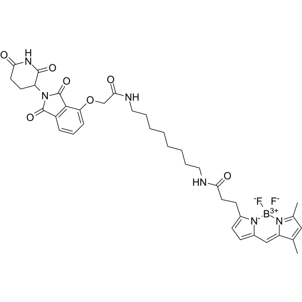 InChI=1S/C37H43BF2N6O7/c1-23-20-24(2)45-29(23)21-26-13-12-25(46(26)38(45,39)40)14-16-31(47)41-18-7-5-3-4-6-8-19-42-33(49)22-53-30-11-9-10-27-34(30)37(52)44(36(27)51)28-15-17-32(48)43-35(28)50/h9-13,20-21,28H,3-8,14-19,22H2,1-2H3,(H,41,47)(H,42,49)(H,43,48,50)