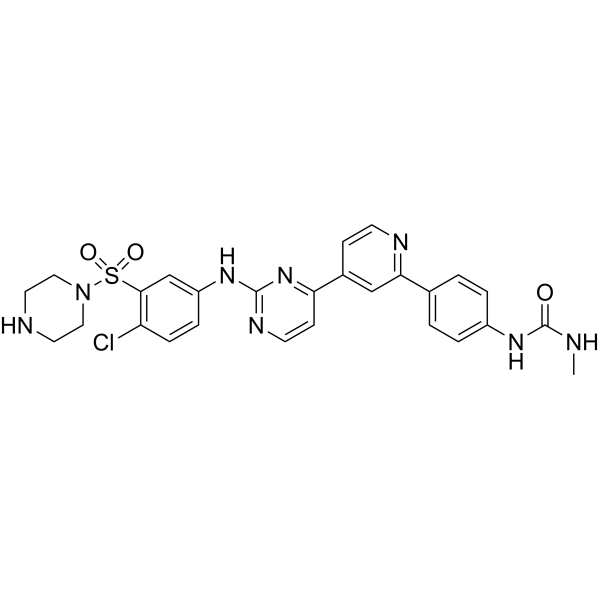 例如,若需制备1 mL的工作液,您可以添加 100 μL 25.0 mg/mL 透明 DMSO 储备液,并将其添加到 400 μL PEG300 中并充分混合。 然后向上述体系中加入50 μL Tween-80,混匀。 然后继续加入450 μL生理盐水至1 mL。 *生理盐水的制备:将 0.9 g 氯化钠溶解在 100 mL ddH₂O中,得到澄清溶液。 配方 2 中的溶解度: ≥ 2.5 mg/mL (4.32 mM) (饱和度未知) in 10% DMSO + 90% (20% SBE-β-CD in Saline) (这些助溶剂从左到右依次添加,逐一添加),澄清溶液。 例如,若需制备1 mL的工作液,您可以添加 100 μL 25.0 mg/mL 澄清 DMSO 储备液,并将其添加到 900 μL 20% SBE-β-CD 盐水溶液中并充分混合。 *20% SBE-β-CD 生理盐水溶液的制备(4°C,1 周):将 2 g SBE-β-CD 溶解于 10 mL 生理盐水中,得到澄清溶液。 View More