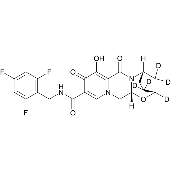 氢、碳和其他元素的稳定重同位素已被整合到药物分子中,主要用作药物开发过程中的定量示踪剂。涉及氘标记药物在人体中的应用的研究表明,这些化合物可能比非氘代药物具有某些优势。氘代药物因其能够影响药物的药代动力学和代谢特性而备受关注。氘代丁苯那嗪是美国食品药品管理局批准的第一个氘代药物。氘代丁苯那嗪用于治疗与亨廷顿氏病相关的舞蹈病以及迟发性运动障碍。正在进行的临床试验表明,许多其他氘代化合物正在被评估用于人类治疗,而不仅仅是作为研究工具。[1] 比克替拉韦 (BIC) 抑制链转移活性,IC50 为 7.5± 0.3 nM。相对于其对链转移活性的抑制,比克替拉韦是 HIV-1 3' 末端加工活性的弱抑制剂,IC50 为 241±51 nM。与模拟治疗对照组相比,比克替拉韦使 2-LTR 环的积累增加了约 5 倍,并使受感染细胞中真正的整合产物数量减少了 100 倍。比克替拉韦有效抑制了 MT-2 和 MT-4 细胞中的 HIV-1 复制,EC50 值分别为 1.5 和 2.4 nM。比克替拉韦在原代 CD4+ T 淋巴细胞和单核细胞衍生的巨噬细胞中均表现出强效的抗病毒作用,EC50 值分别为 1.5±0.3 nM 和 6.6±4.1 nM,与 T 细胞系中获得的值相当 [2]。