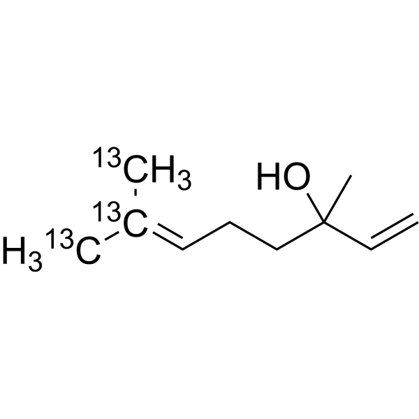 氢、碳和其他元素的稳定重同位素已被整合到药物分子中,主要用作药物开发过程中的定量示踪剂。涉及人类使用氘标记药物的研究表明,这些化合物可能比非氘代药物具有某些优势。氘代药物因其可能影响药物的药代动力学和代谢特性而受到关注。氘代丁苯那嗪是美国食品和药物管理局批准的首个氘代药物。氘代丁苯那嗪用于治疗与亨廷顿氏病相关的舞蹈病以及迟发性运动障碍。正在进行的临床试验表明,许多其他氘代化合物正在被评估用于人类疾病的治疗,而不仅仅是作为研究工具。 [1] 芳樟醇(0-2000 μM,24-72 h)可通过氧化应激诱导癌细胞(U87-MG、HepG-2、SW620 等)凋亡,同时保护正常细胞 PC12 [4]。芳樟醇(0-2000 mg/mL,0-72 h)通过破坏细胞膜发挥抗菌作用[4]。芳樟醇(0-2 mM,24-48 h)通过诱导 G0/G1 和/或 G2/M 细胞周期停滞来抑制 A549 细胞增殖,而不影响正常肺 WI-38 细胞的细胞活力。芳樟醇抑制 A549 细胞迁移[5]。